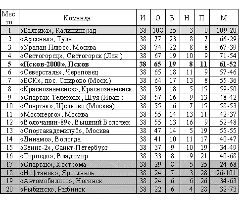 Незаслуженно проиграв в Череповце «Северстали» и буквально разгромив в Рыбинске одноименную команду, ФК «Псков-2000» занял в итоге во втором дивизионе в зоне «Запад» пятую строчку в турнирной таблице.