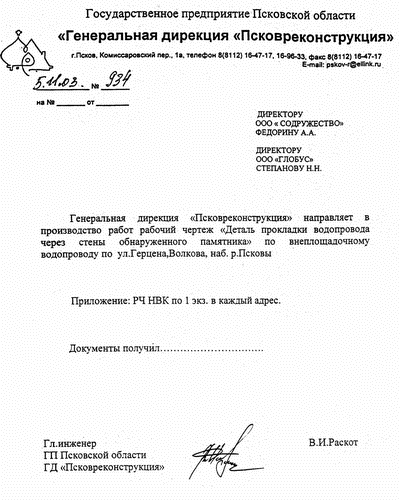 А здесь – и НПЦ, и заказчик – гендирекция «Псковреконструкция» (А. Т. Васильев) настаивают на продолжении работ по строительству водовода с тем, чтобы пробить стены толщиной 1м 70 см, вместо того чтобы опустить трубу и пройти ниже. Это был бы частично неразрушающий метод (по уму - надо бы вообще обойти), но денег мало, деньги Госстроя, поэтому предложили опустить трубу под пол меньше чем на метр. Это был бы неразрушающий метод – минимальная корректировка проекта и минимальные затраты. Сейчас долбить стенки – гораздо дороже и более трудоемко. Надо собрать независимую экспертизу, но никто не намерен этого делать, так как уже есть утвержденный проект.