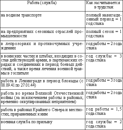 При подсчете трудстажа отдельные периоды работы засчитываются в ЛЬГОТНОМ ПОРЯДКЕ: