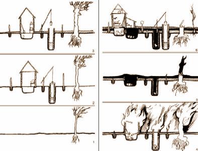 Уже в момент возникновения поселка на пустом месте (рис. 1) начинается более или менее интенсивное слоеобразование — возводятся жилища, роются колодцы (рис. 2). В период существования поселения вокруг построек за счет выметенного из домов мусора, выброшенных за окно объедков и проч., нарастает культурный слой (рис. 3). В том случае, если поселение гибнет в пожаре (рис. 4), культурный слой предшествующего времени перекрывается зольно-угольным слоем, причем этот слой заполняет подвалы сгоревших домов и колодцы, а среди углей оказываются несгоревшие или обугленные предметы быта — все то, что не удалось спасти (рис. 5). Если поселение возродилось на пепелище, то вновь образующийся культурный слой перекрывает слой пожара, и все повторяется сначала (рис. 6). Разумеется, приведенный пример достаточно условен, и в реальности стратиграфия культурного слоя на поселении оказывается значительно более сложной: разновременные ямы (подвалы построек, помойки, колодцы) прорезают друг друга, при строительных работах образуются разнообразные линзы и прослойки строительного мусора, какие-то из прослоек уничтожаются при планировочных работах, предшествующих новому строительству, а периоды запустения материализуются стерильными от следов жизнедеятельности человека прослойками погребенного дерна.